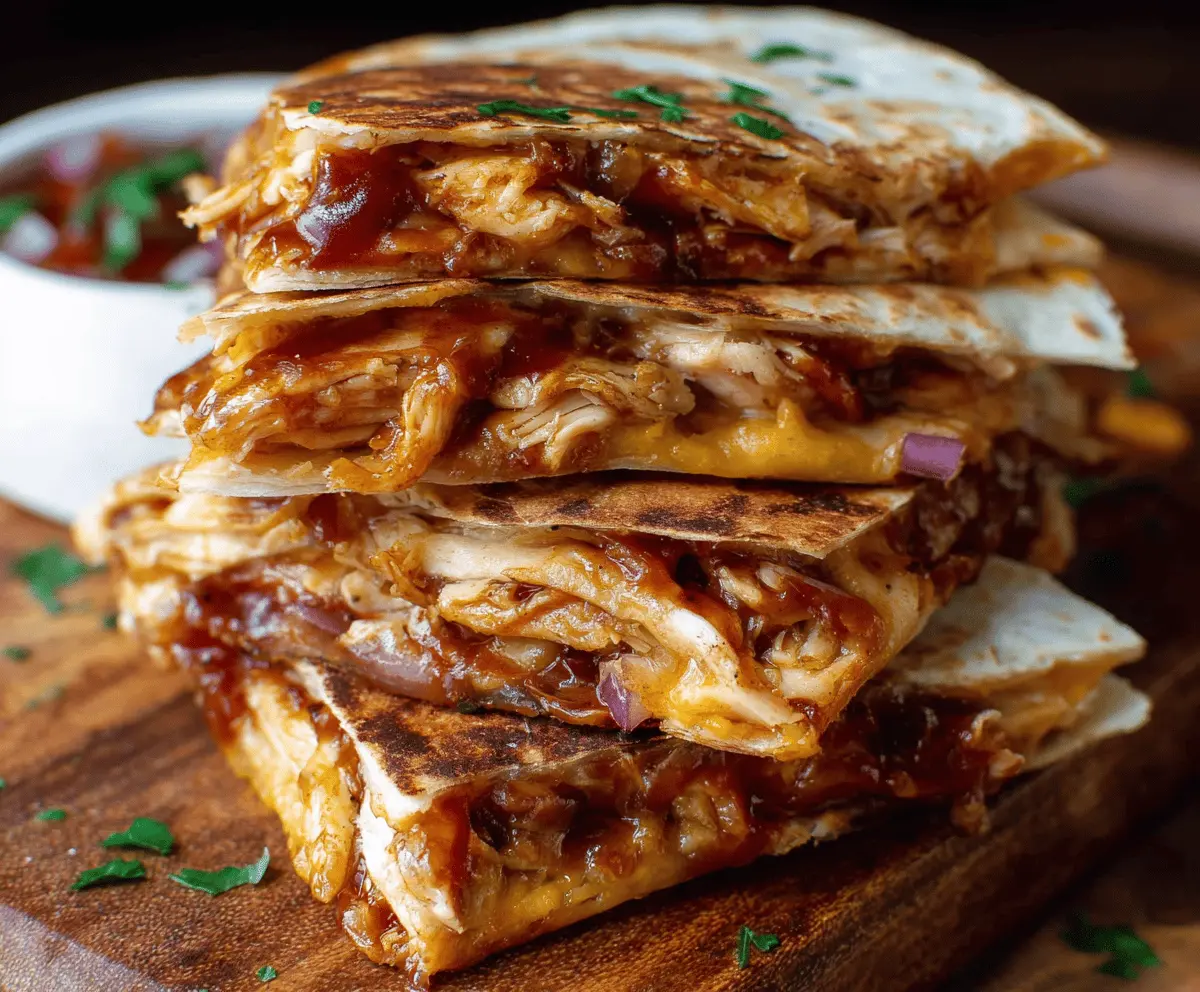 Delicious BBQ chicken quesadilla filled with melted cheese, grilled chicken, and smoky barbecue sauce, served hot and crispy