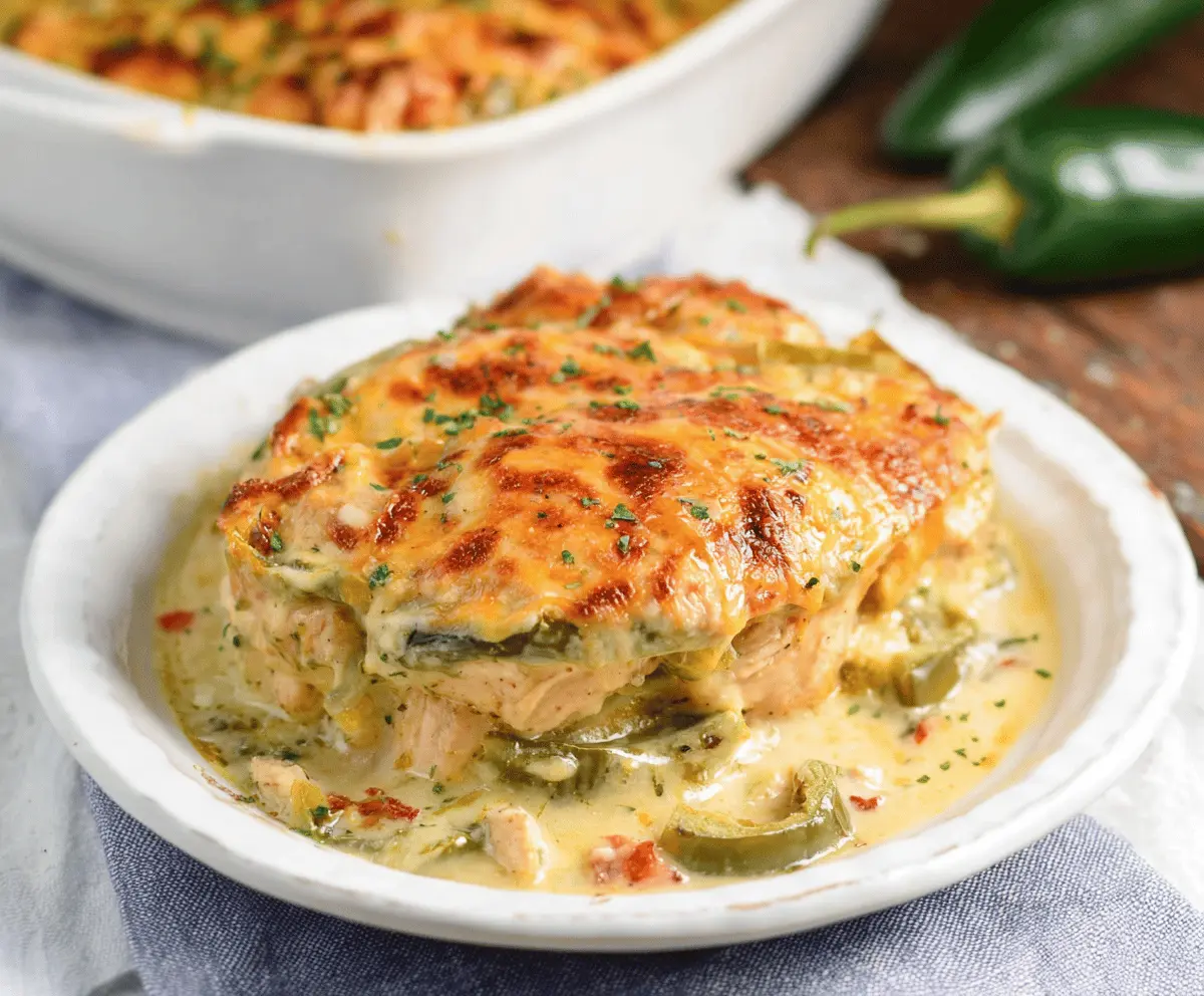 Delicious Chicken Poblano Casserole topped with creamy sauce and melted cheese, served hot in a baking dish