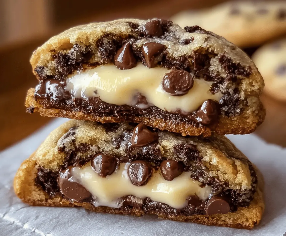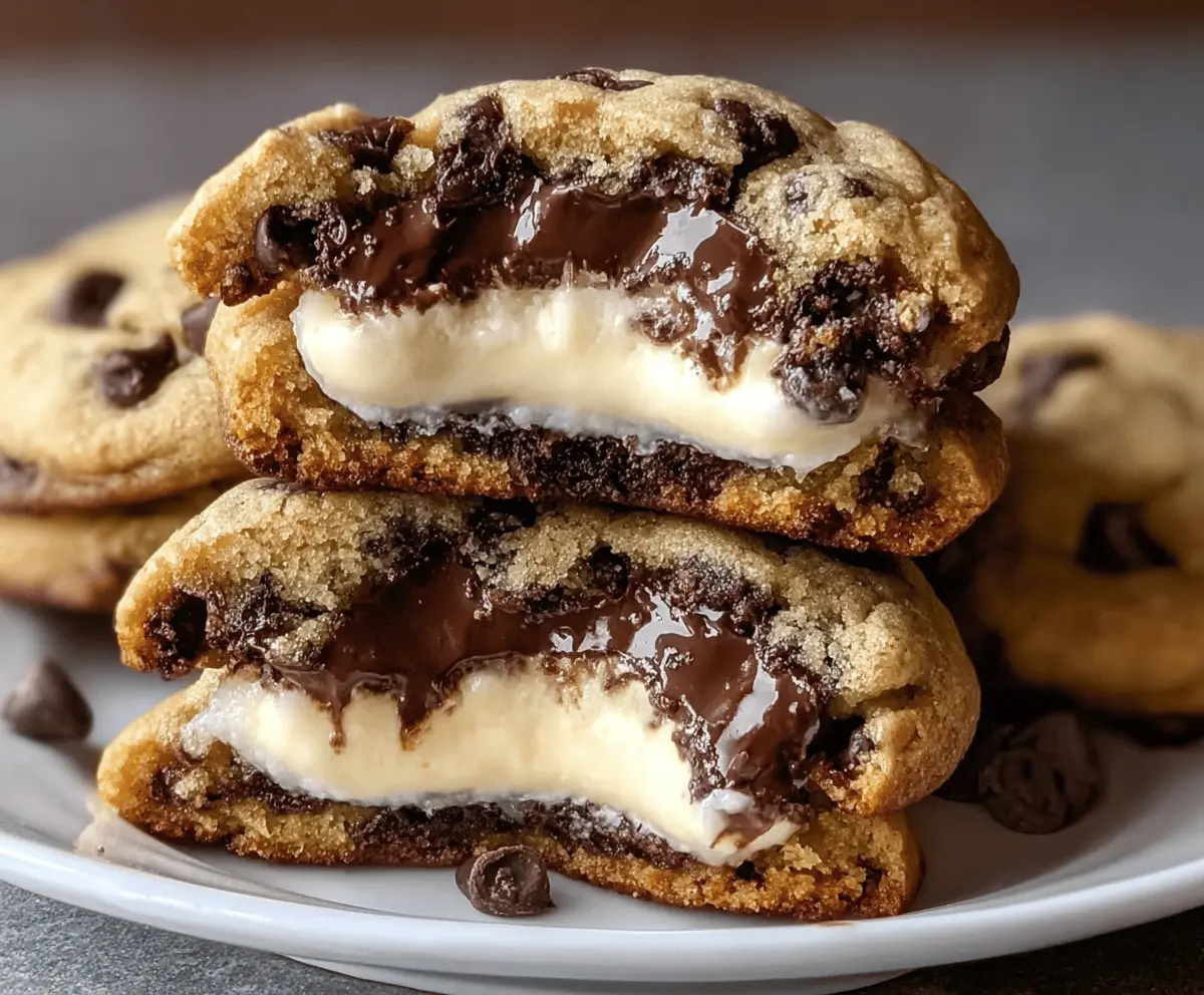 Delicious chocolate chip cookies filled with creamy cheesecake filling, perfect for satisfying your sweet tooth