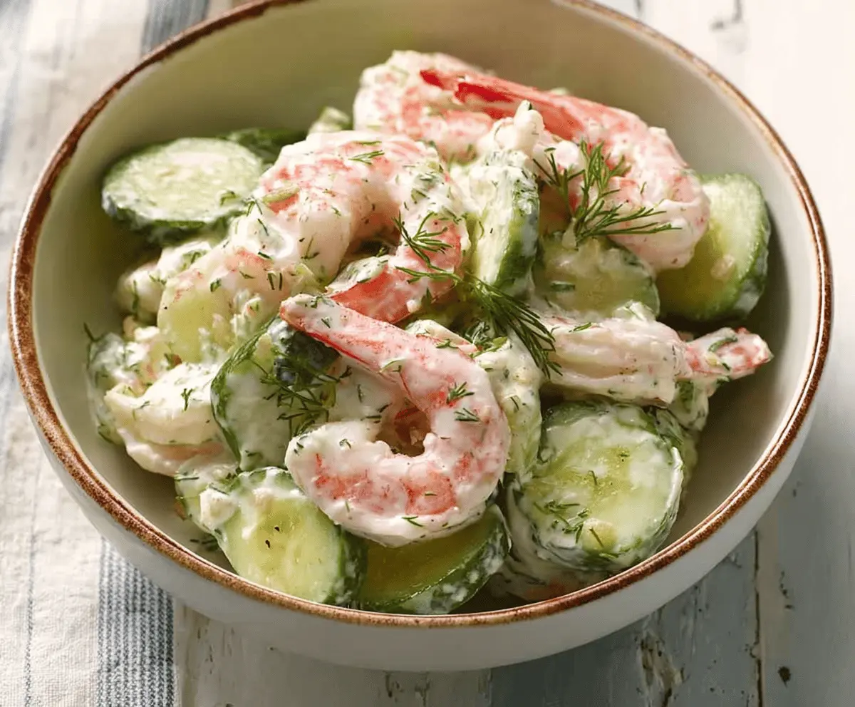 Add the shrimp and cucumber slices into the dressing. Gently toss until everything is well coated with the creamy mixture.