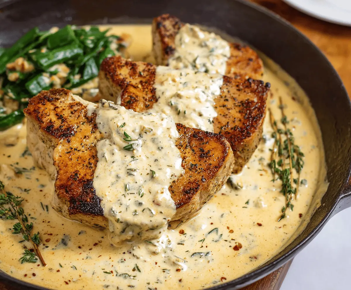 Creamy garlic pork chops served on a plate with herbs, featuring tender, juicy pork topped with rich garlic sauce