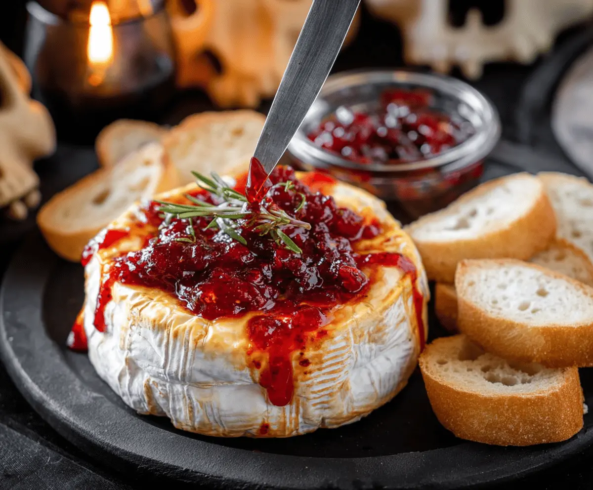 Place the baked Brie on a platter surrounded by breadsticks, crackers, or baguette slices. Add some Halloween decorations like mini pumpkins or spooky napkins nearby if you like. Serve it warm and enjoy the creamy, sweet, and slightly tart flavors with your favorite dippers!