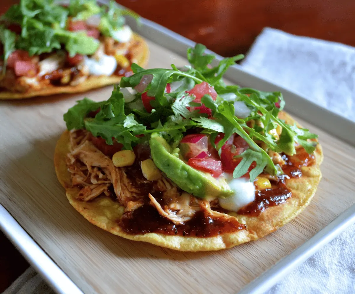 Spread a layer of refried beans or mashed avocado on each crispy tortilla—this adds creaminess and helps hold toppings in place. Then evenly top with the warmed shredded chicken.