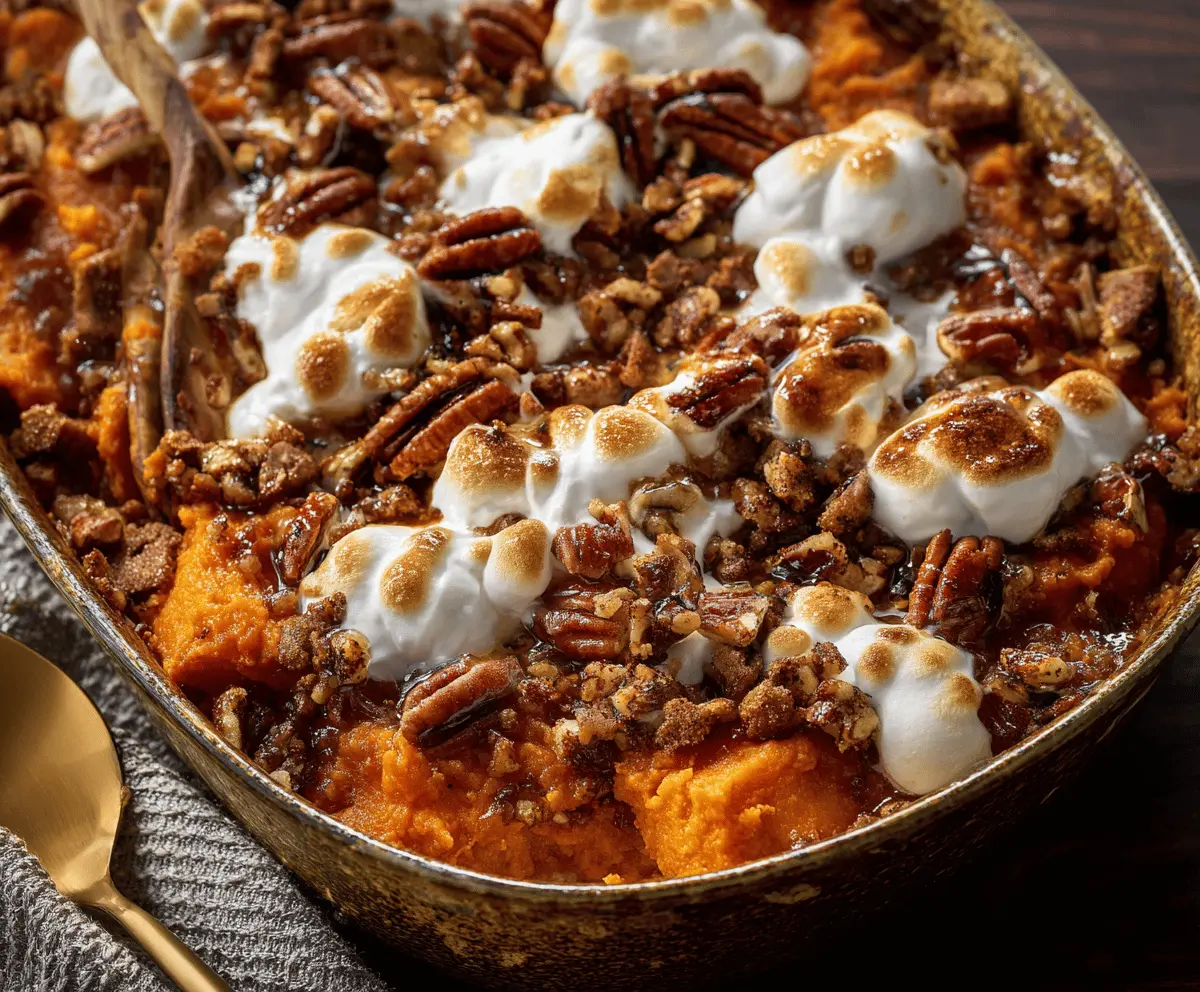 Grease a 9×13 inch baking dish. Spread the sweet potato mixture evenly across the dish. If you’d like, gently mix some mini marshmallows into the mashed potatoes or scatter them on top for a gooey, sweet touch.